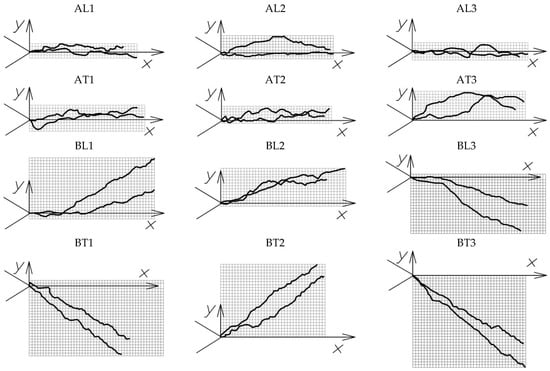 As can be seen in Figure 13, the crack can propagate in either the straight or the negative direction to the Y-axis. In the AT direction, compared to the AL direction, the kinking of the fracture surface was about 40% higher, on average; the maximum point of the curve was also higher from the OX axis and the crack path was slightly longer, suggesting a more pronounced mode II crack propagation pattern. The mode III form was similar in both cases but was unstable due to the large errors observed. In all WPC-A tests, the maximum kink was observed at the very beginning of crack propagation. Thus, in the BT direction, compared to BL, the fracture surface, on average, kinked more, even up to several times more. The crack usually had the highest kink angle θ (about the OZ axis) in the BL direction, but there was a less frequent case where the kink angle at the beginning of the crack was small, up to 4°, but the highest kinking was observed along the longer section of the path. In the BT direction, the maximum angle was observed at the very beginning in all cases. Even up to several times more pronounced were WPC-B modes II and III. Overall, the probability of the crack starting to kink to one side or the other at the very beginning of the crack opening was >80%.