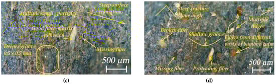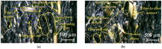 Figure 14 shows images of the fracture surface of WPC-A and WPC-B composite specimens after testing. It can be seen that the surface of WPC-A was significantly rougher than that of WPC-B. Due to the coarser wood particles in WPC-A, its higher resistance to deformation and more pronounced decomposition phenomena, such as fiber pull-out, breakage, residues of decomposition products, etc., were more evident. For the deformation of coarser particles, the amount of energy required to break or tear them out with good adhesion to the matrix was higher. In contrast, the fracture surface of the WPC-B composite appeared smoother over a small area, with no major indentations left by the tearing of smaller particles from the matrix. Nevertheless, the surface showed variously shaped indentations with larger blunt edges, torn out particles, ridges of plastic with wood dust formed during deformation and steeper transitions in the fracture planes. The fracture surfaces were also strongly influenced by the material of the matrix, with the WPC-A matrix being largely amorphous, whereas WPC-B was semi-crystalline.