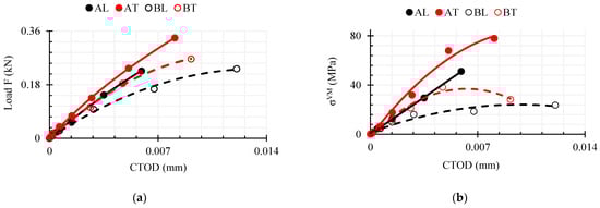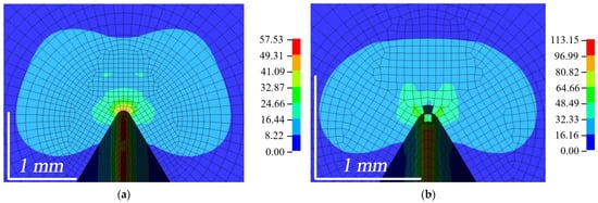 The distribution of the equivalent von Mises stresses is shown in Figure 15. It was observed that the failure of elements started at the top of the outer surfaces, while the plastic zone was more constrained in the inner part of the composite []. The highest stresses were obtained when bending the WPC-A composite specimen. As can be seen in Figure 15b, once the AT composite started to fail, the stresses around it reached ≈50 MPa. The stresses were higher in the unbroken zone of the crack front, which was more constrained. The AL composite was very close to the limit of failure, with stresses up to 50 MPa. In contrast, the composite in the BL direction had the lowest stresses, around 30 MPa, while BT was also close to the limit of failure with stresses close to 50 MPa at the crack tip. The plastic zone of WPC-B was more pronounced, indicating a higher plasticity of this composite.