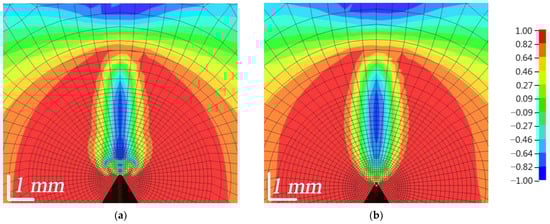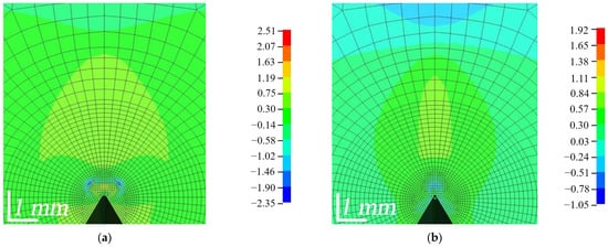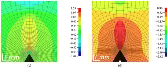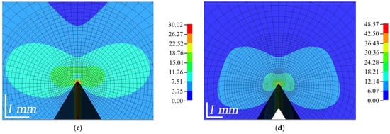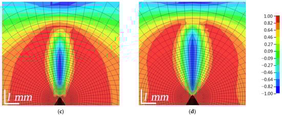 The distribution of the Lode angle parameter ξ is shown in Figure 18. In the red zone, where the value of the parameter is equal to 1, pure tensile stresses predominated, while in the blue zone, where the value is equal to −1, pure compressive stresses occurred. In the FZP zone, a zone of flame-like stresses was formed; compressive stresses predominated in the central part, surrounded by a narrower zone of shear stresses and finally a large zone of tensile stresses. As the load was increased, the shape of the flame-like stress zone changed, and as the composites began to fail, the bottom of the zone near the top of the crack became uneven, jagged and jellyfish-like. As can be seen, WPC-A started to erode in the AT direction and soon started to erode in the AL direction, as indicated by the von Mises stresses, while WPC-B was still in the process of failure. Shear stresses in the FZP zone had a significant influence on the opening of the crack. The concentration of the wood particles, their size, orientation and the strength of adhesion to the matrix had a major influence on the opening of the crack and its growth.