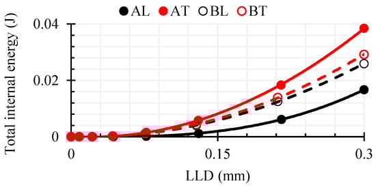 In the first phase, the molecules of the material were unstressed and branched, so that even a very small stress would cause a sufficiently large deformation without stretching the plastic molecules or fiber. This region was almost linear in practice and has a very low elastic modulus (toe modulus). Materials may have high ductility, although KIC may be very low, but due to the very low shear modulus in this zone, the released strain energy of deformation cannot be transferred to the FPZ []. In the second phase, the material exhibited a non-linear mechanical behavior. The molecular chains straightened and lengthened with load. At the same time, the wood fibers in the matrix aligned themselves in the direction of the load, which results in a higher carrying load. Since the area under the curve in the second zone was small compared to that in the third zone, the amount of deformation energy released was also small. Finally, in the third phase, the material became more rigid, and a linear part was observed as the molecules aligned in the loading direction. The length of the first zone may have been large enough for tissues of biological origin, in the case of this study. Comparing the amount of curve shift in the x-axis with the maximum shift before composite failure (≈0.99 mm), the shift values (%) were as follows: 3.74 (AL), 8.18 (AT), 5.76 (BL), 6.77 (BT). It can be seen that a higher discrepancy and nonlinearity were obtained when the composite was deformed in the T direction. Nevertheless, the discrepancies were small compared to the overall result. Although the MAT_143 model produced a non-linear part of the curve at the initial time point, it was not quite as close to ideal bending as the experimental one. The numerical model itself, while performing well, does not contain more detailed parameters describing viscoelastic behavior to more accurately model the behavior of the material in the first phase, when the molecules have only just experienced load and when strains were large compared to the tiny stresses, which means the simulation result is less accurate in representing the processes occurring in this complex initial phase.