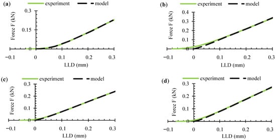 Comparison of experimental and simulation force-deflection curves: (a) AL; (b) AT; (c) BL; (d) BT.