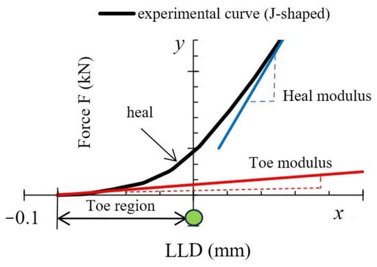 Toe compensation is required by the standards [,,], since it is assumed that the non-linear portion is connected to slack, measurement errors and other factors. The following toe compensations of the experimental curve were made in this work (in mm): 0.037 (AL), 0.081 (AT), 0.057 (BL), and 0.067 (BT). This toe compensation also occurred in the x-axis. As seen in Figure 20, the curves were shifted rather than being displayed from the x-axis zero point. This was done to draw attention to the fact that others studying WPCs may run into similar circumstances. Not all authors agree on the need for curve shifting and to what extent it is related to the measurement errors of the instrument itself and the processes occurring in the material; therefore, this compensation has been made based on both experimental and numerical data. The initial part of the deformation curves of the materials resembles a J shape, which is a widespread deformation behavior, as it is characteristic of biological soft tissues (skin, arterial walls, collagen), as well as textiles, etc. This deformation curve is also very important for the analysis of polymer composites. The J-shaped curve is divided into three regions [,]: