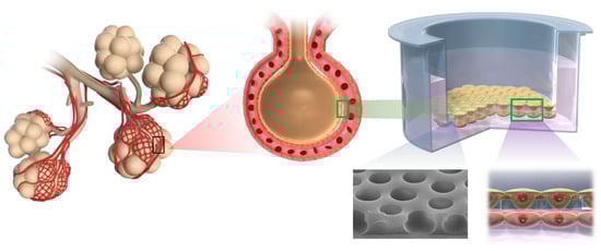The lungs, essential for sustaining life by facilitating gas exchange, may also serve as sites for inflammation and respiratory disease reactions induced by inhaled environmental chemicals and allergens [,,]. Thus, accurately replicating the alveolar structure and function in vitro is crucial for understanding the pathophysiology of lung diseases and developing new treatments or drug screening tools. The alveoli consist of closely packed type I and II alveolar epithelial cells and pulmonary microvascular endothelial cells, which form a dual-layered sheet with a total thickness of approximately 2 μm, functioning as independent sheets that facilitate gas exchange []. Thin-film substrates, such as cell culture inserts that culture two different cell types separately, are typically used to simulate this microenvironment [,]. In these previous studies, a bilayer alveolar model was constructed using commercial well-plate format cell culture inserts. In this model, the primary cultured cells of alveolar epithelial cells and capillary endothelial cells, which are the major cell types constituting the alveoli, as well as cell lines such as cancer cells, are separated by a porous membrane. This model has been utilized to study the effects of inflammatory substances, evaluate drug efficacy, and assess pharmacokinetics. Huh and colleagues developed an elaborate 3D alveolar model using micro electro mechanical systems (MEMS) technology by creating a 10 µm thick PDMS-based porous membrane to replicate the bilayer alveolar sheet. They also demonstrated that this bilayer sheet could be cultured under mechanical stretching induced by pneumatic pressure []. However, MEMS technology is not readily accessible to the general research community, and as the complexity of MEMS structures increases, issues such as reproducibility between samples arise, making it not necessarily suitable for high-throughput assays like drug screening. However, recent studies have reported the formation of poly(caprolactone) PCL fibers with nanometer-scale diameters using electrospinning. For example, an alveolar model partitioned by a fibrous thin film with a thickness of 2 µm has been constructed [].