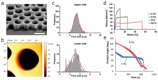 Characterization of the physicochemical properties of the porous polyurethane membrane (P-PU) used in AlveoMPU. (a) Scanning electron microscopy (SEM) image viewed from an oblique angle. (b) Atomic force microscopy (AFM) height image of the AlveoMPU membrane. (c) Distribution of pore diameters for the upper and lower sides of the AlveoMPU membrane. Red curved line: Gaussian distribution obtained from the frequency data of pore sizes. (d) Stress–strain curve for flat-polyurethane (F-PU), porous PU (P-PU; AlveoMPU), polycarbonate with 3 µm pores (PC3) and polyethylene terephthalate with 3 µm pores (PET3). (e) Time dependency of contact angles of F-PU and the P-PU. Two independent samples for F-PU and P-PU were replicated and are denoted by the blue and red curved lines, respectively.