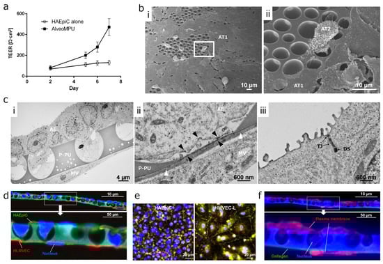 Formation of alveolar model and barrier function on AlveoMPU membrane. (a) The temporal progression of trans-epithelial electrical resistance (TEER). (b) Scanning electron microscopy (SEM) images of the top surface of AlveoMPU; (b-ii): zoomed-in view of the image in (b-i); AT1 and AT2: type 1 and 2 alveolar epithelial cells, respectively. (c) Transmission electron microscopy (TEM) images of a cross section of AlveoMPU; P-PU: porous polyurethane of AlveoMPU, AE: alveolar epithelial cell, MV: microvascular endothelial cell; (c-i): The formation of sheets by alveolar epithelial and vascular endothelial cells across P-PU; (c-ii,c-iii): magnified views within white and black frames in (c-i); white arrowhead: collagen thin layer, black arrowhead: hemidesmosome-like structure, TJ: tight junction, DS: desmosome. (d) Immunostaining of alveolar epithelium (green: cytokeratine A1/A3) and vascular endothelium (red: vimentin)-specific markers and (e) tight junction marker proteins (green: Occludin, red: ZO-1, blue: nuclei) and (f) collagen backing layer (green: Type I Collagen, red: plasma membrane).