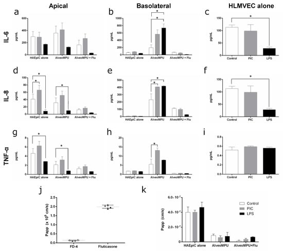 Evaluation of inflammatory cytokine secretion and pharmacokinetic testing utilizing AlveoMPU. Cytokine production of AlveoMPU models into apical (a,d,g), basolateral sides (b,e,h) or HLMVECs culture supernatant (c,f,i); IL-6: (a–c), IL-8: (d–f) and TNFα: (g–i). (j) Apparent permeability coefficient (Papp) of 4 kDa dextran-FITC (FD4) and fluticasone propionate. (k) Papp of FD4 after pretreatment of fluticasone propionate; white bar: control; gray bar: poly (I:C) (PIC); black bar: lipopolysaccharide (LPS); *: statistically significant difference (p < 0.05).