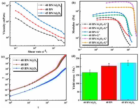 Rheological properties of 40 BN/Al2O3, 40 BN, and 45 BN/Al2O3 slurries: (a) plots of slurry viscosity versus shear rate; (b) plots of modulus and shear stress of slurries; (c) plots of stress-strain relationship of slurries; (d) plots of yield stress of slurries.