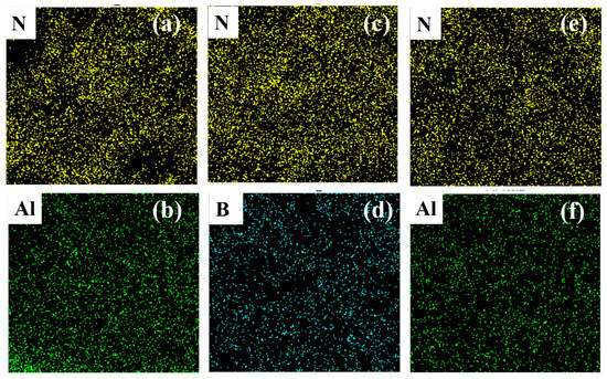 EDS images of different printed parts: (a,b) 40 BN/Al2O3; (c,d) 40 BN; (e,f) 45 BN/Al2O3.