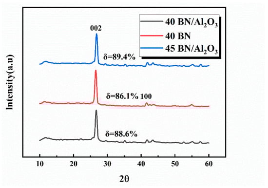 To further explore the filler orientation in the PDMS matrix, XRD measurement was employed to quantify the orientation degree. Figure 6 depicts the XRD measurement results of 40 BN/Al2O3, 40 BN, and 45 BN/Al2O3 composite materials. As depicted in the XRD pattern, there is a distinct sharp peak at 27°, indicating the typical crystal structure of BN nanoflakes []. The degree of orientation δ was taken and calculated using Equation (2) according to the previous relevant work []: