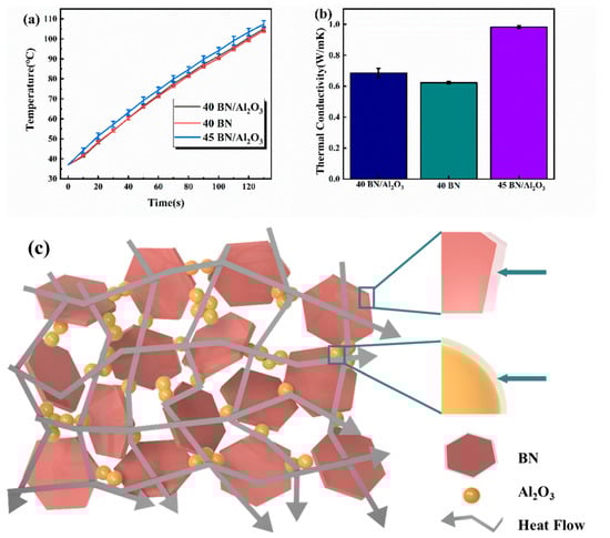 In order to vividly demonstrate the thermal management ability of the PDMS-based composites with the binary fillers, the top surface temperature of the columniform device (diameter: 12.6 mm and height: 3 mm) made of 40 BN/Al2O3, 40 BN, and 45 BN/Al2O3 composites in the same environment was recorded, respectively, where the bottom surface of the cylindrical device was deposited on a heater with a temperature of 200 °C. The results are depicted in Figure 7a. After being heated for 130 min, the temperature of 45 BN/Al2O3 was recorded as 107 °C, which was higher than those of 40 BN/Al2O3 and 40 BN. It could be observed that the best thermal conductivity performance was obtained from the 45 BN/Al2O3, proving its superior heat transfer capabilities. In the composites with the same solid content, the temperature change of the 40 BN/Al2O3 was greater than that of 40 BN, which indicates an improved thermal conductivity achieved by the synergistic effect of the binary fillers. The thermal conductivity of the 40 BN/Al2O3, 40 BN, and 45 BN/Al2O3 composites were measured at 0.68, 0.62, and 0.98 W/(m·K) (Figure 7b), respectively, which was in keeping with the thermal management behavior of these three samples in Figure 7a. As reported in the previous work [], the thermal conductivity of the pure PDMS material was measured at 0.19 W/(m·K). Therefore, it could be concluded that the BN nanoflakes showed an obvious positive influence on the thermal conductive performance of PDMS material. Meanwhile, at the same filler loading, the thermal conductivity of 40 BN/Al2O3 was improved by 10% compared to that of sample 40 BN. The difference in the thermal conductive behaviors of these samples verifies the effect of binary thermal conductive fillers in improving the thermal conductivity. To better present the thermal conductivity mechanism of the BN/Al2O3/PDMS composites with binary fillers, a heat transfer schematic was constructed, as shown in Figure 7c. Due to the introduction of spherical Al2O3 filler, the space between the BN nanoflakes was filled by Al2O3 spheres, thus improving the integrity of the thermal conductive network. Therefore, a more complete thermal conductivity network was formed in the BN/Al2O3/PDMS composites, which was more favorable to improving the thermal conductivity of the fabricated parts.
