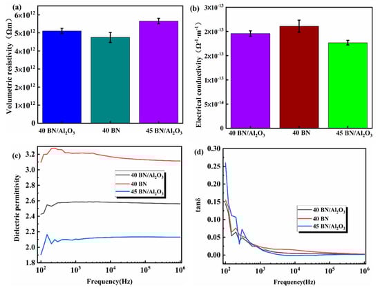 Electric insulation performance of 40 BN/Al2O3, 40 BN, and 45 BN/Al2O3; (a) volume resistivity; (b) conductivity; (c) dielectric constant; (d) dielectric loss.