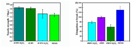 Mechanical properties of the PDMS-based composites (40 BN/Al2O3, 40 BN, 45 BN/Al2O3, and pure PDMS matrix): (a) tensile strength; (b) tensile elongation at break.