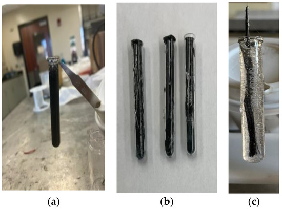 The SCF/Ep mixture (M-1) was poured into a glass test tube (length/diameter: 75 mm × 10 mm) using a syringe to study frontal polymerization. Test tubes with (a) uncured SCF/Ep composite mixture (M-1), (b) cured SCF/Ep composites, and (c) single continuous carbon fiber tow in uncured epoxy resin mixture (M-2) are shown in Figure 1. Neat epoxy resin, thermal, and cationic initiator mixture (M-3) was poured into a test tube to carry out FP and make cured neat epoxy. An external heat source from a hot plate was incorporated at the bottom of the test tube to trigger the exothermic reaction of FP. The initiation temperature of the hot plate was calibrated using an IR camera. Once the reaction initiated and proceeded, the test tube was removed from the triggering heat source. As the frontal polymerization continued, the temperature distribution and the path were monitored using an IR camera. The time was recorded as the reaction proceeded along the test tube length. Frontal velocity was calculated from the time and travel path.