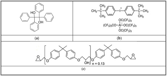 Structure of TPED, cationic initiator, and Epon 828. (a) TPED-C26H22O2 (b) Bis [4-(tert-butyl) phenyl iodonium Tetra (nonafluoro-tertbutoxy) aluminate (IOC-A) (c) DGEBA (diglycidyl ether of bisphenol A or Epon 828).