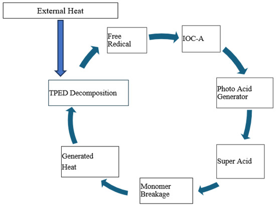 The frontal polymerization (FP) process, especially in the context of epoxy resins, is initiated and propagated through a series of chemical reactions that the initiators catalyze. The thermal initiator (TPED) and the cationic initiator are shown in Figure 2. The structure of TPED, the cationic initiator, and Epon 828 work together to create conditions favorable for polymerization but in different roles [42]. TPED, serving as the thermal initiator, is primarily involved in generating the reactive conditions necessary for the cationic initiator to activate [43]. It may not directly interact with the monomers to break them and form polymers. Instead, its role is to facilitate the formation of active sites (cationic species) by the cationic initiator through thermal decomposition or by forming a charge transfer complex that helps to activate the initiator [44]. Upon activation facilitated by the thermal decomposition of TPED, the cationic initiator generates a cationic species that can interact with the epoxy monomer shown in Figure 2 [45,46]. This interaction typically involves the opening of the epoxide ring of the monomer, allowing it to react with other monomer molecules or growing polymer chains. This is the key step where the monomer is “broken” (or, more accurately, activated and reacted) to form the polymer [47]. The cationic species effectively acts as the catalyst that initiates the polymerization by opening the monomer’s epoxide ring, enabling the linking of monomer units into a polymer chain [38]. Thus, breaking the monomer chain generates the heat to decompose the TPED further.