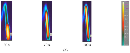 Figure 5 shows IR images displaying temperature distribution surrounding the reaction zones and path at different time intervals for neat resin, SCF/Ep composites, and CCF/Ep composites. The temperature profile has three stages due to heat wave propagation such as steady (no polymerization), rising (front/heat wave coming), and fall (front/heat wave departing). In the steady state, no polymerization occurs since no temperature changes occur in the reaction front. Thermal diffusion raises temperatures as the front approaches. Due to intense exothermic reaction, the narrow front reaction zone’s temperature increases fast to Tmax during the rising state. Thermal diffusion lowers the temperature when the front leaves during the fall stage [48].