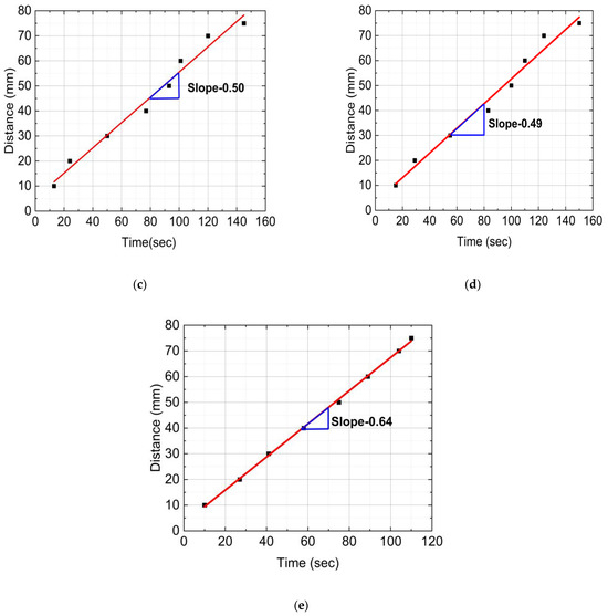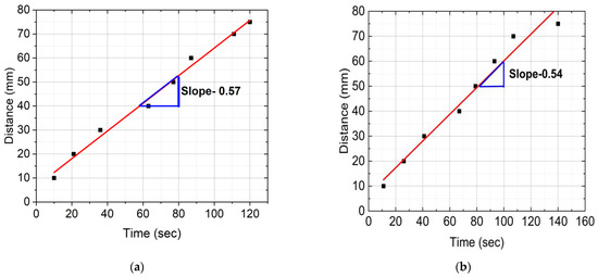 Figure 6 provides distance versus time plots of FP reactions for neat epoxy resin, SCF/Ep composites, and CCF/Ep composites. These data were captured from the IR images. The time to reach a marked distance in the test tube was recorded by a stopwatch. First, every 10 mm, the test tube was marked using a permanent marker. Then, the time was recorded when the polymerization head was reached in each marked point (every 10 mm). The reaction’s frontal velocity (Vf) plays as an essential parameter in the polymerization process. It was calculated from the slope of a linear plot generated from the data points shown in Figure 6.