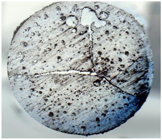 Figure 7 shows the microstructure of cured neat epoxy. The micrographs show the presence of voids and cracks initiated from the central region. In general, voids are formed mostly due to the formation of gases during the curing process. The presence of voids in mixtures before curing is also not desirable for achieving a cured sample without voids. As a result, the efficiency of mixture preparation without voids plays an important role in specimen preparation. The efficiency of the specimen preparation may be enhanced by pouring mixtures into test tubes directly using a funnel instead of a syringe. Suction by a syringe may result in bubble formation into the mixture. Mixtures with bubbles in test tubes before curing may result in enhanced void contents in cured samples. The cracks that are initiated at the central region and then propagated toward the periphery are possibly because of the residual stress generated due to the temperature gradient. The insulation of the glass tube might minimize such a temperature gradient and minimize crack propagation. During the curing process, the covalent bond replaces the secondary van der Waals bond, causing chemical shrinkage in the resin and developing residual stress. Moreover, polymerization in a confined test tube (illustrated in Figure 1) restricts the thermal expansion of the epoxy. The measured void content is almost 12% by volume, which is comparatively high compared to conventional techniques such as autoclave and vacuum bagging. The presence of such a high void content and internal cracks due to residual stress significantly degrades the mechanical properties of FP-processed composites.