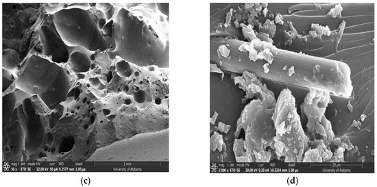 SEM image of fractured SCF/Ep: (a) large void contents and matrix cracking, (b) fiber pullout, debonding, and matrix cracking, (c) SCF dispersion, and (d) fiber pullout and matrix on fiber surface.