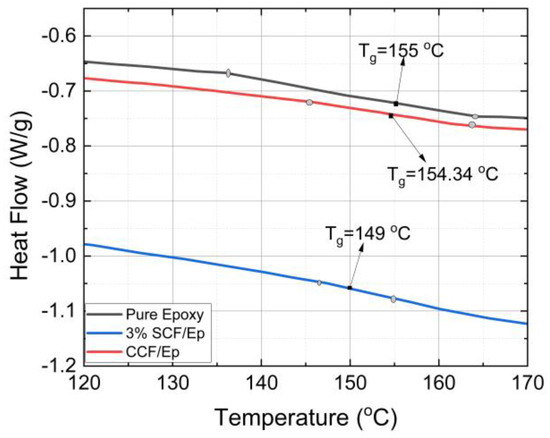 The Tg and αc of FP-cured neat epoxy resin and SCF/Ep composites were determined from the heat flow vs. temperature plots obtained from the differential scanning calorimetry (DSC) experiments. Table 3 shows the heat flow vs. temperature plots of powdered cured neat epoxy, 3%-SCF/Ep and CCF/Ep composites. The method to determine Tg using a DSC is described earlier. Figure 10 shows the Tg of neat epoxy (155 °C) and SCF/Ep with 1%, 2%, and 3% of SCF concentrations. The Tg of neat epoxy is seen to be comparatively higher than SCF/Ep composites. The effects of SCF weight concentration within a range of 1–3% show insignificant variations in the Tg of SCF/Ep composites. As a result, only one such plot is shown in Figure 10. The Tg of continuous CCF/Ep composites is seen to be 154.34 °C which is almost same as neat epoxy. The addition of short carbon fibers (SCFs), which leads to a slightly lower Tg of 149 °C, can be attributed to the interaction between the SCFs and the epoxy matrix. These interactions can disrupt the polymer structure, making it slightly more flexible and lowering its Tg. In contrast, the Tg of epoxy with continuous fiber is observed to be almost the same as neat resin. Such a trend is most likely due to less interaction in the neat epoxy polymer structure.