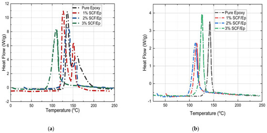 The heat flow vs. temperature plots of both uncured and partially cured pure epoxy and SCF/Ep are shown in Figure 11a,b in order to determine the degree of cure (αc). It is known that the area under the peak is the total heat of reaction [50]. The heating rate in the test was kept uniform at 3 °C/min. The total heat flow is not seen to be changed with the heating rate. Table 3 shows total heat flow for initially uncured neat epoxy (278 J/g) resin which is observed to be reduced with the inclusion of SCF. The heat flow for 1%, 2%, and 3% SCF /Ep composites is seen to be 230 J/g, 219 J/g, and 189 J/g, respectively. In the case of cured samples, the heat of reaction for pure epoxy, epoxy with 1%, 2%, and 3% SCF is seen to be 42 J/g, 39 J/g, 45 J/g, and 50 J/g, respectively. These magnitudes are comparatively low as they correspond to uncured resin that remains in FP-processed samples. The degree of cure for pure epoxy and 1%, 2%, and 3% SCF/Ep composites is observed to be 85%, 81%, 75%, and 71%, respectively. These are calculated using the equation provided earlier. The degree of cure reduces with the increase in the SCF percentage. The degree of cure is also seen to be higher in pure epoxy.