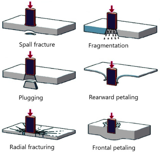 Another well-known failure mode is referred to as “petaling” (see Figure 1), which occurs when a high amount of tensile stress is developed at the back side of an impacted FRP panel during an event and is released once the damage has occurred. Another phenomenon known as “fragmentation”, also shown in Figure 1, is caused by the localized pulverization of the material upon impact and is seen more prominently in brittle materials [41,42]. Finally, “plugging” is where a cylindrical portion of the impacted material is ejected during an impact event, which is caused by a high amount of through-thickness shear stress development around the borders of a blunt projectile [41,42]. This damage mode is illustrated in Figure 1.