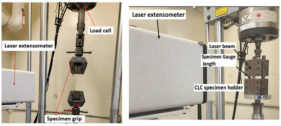 The specimens were tested using a digitally controlled MTS servo-hydraulic universal test system. The strain in the gauge length was measured using a laser extensometer (Model LE-05, by Electronic Instrument Research, Irwin, PA, USA), shown in Figure 2. This extensometer utilizes two retro-reflective pieces of tape to reference the distance during a testing event. The setup for a typical compression test is shown in Figure 2. The compression specimen is restrained by the combined loading compression fixture (CLC) fixture as per ASTM D3410 [55].