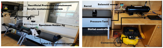 The experimental setup for the HVI test utilizes a compressed-air gas gun, designed and fabricated in-house. It consists of a pressure gas chamber (which holds air or helium if a higher speed is desired), a barrel, an electro-mechanical solenoid valve, and a digital microelectronic system controlled by Arduino code and an air compressor, as shown in Figure 4. A breach is located at the rear end of the 25 mm diameter barrel, which accommodates the loading of the projectile, held in a specially designed sabot. The microcontroller controls the operation of the propelling mechanism. The projectiles are propelled using an electro-mechanical solenoid valve that is closed when uncharged but opens once charged. Compressed air was used as the propellant gas as it could accommodate the maximum values of energy required; however, a helium cylinder is also available if higher energies are required.