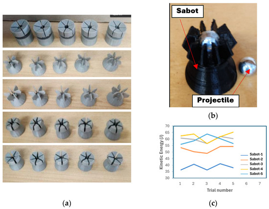 A 9.53 mm diameter solid stainless-steel ball was used as the projectile based on the rationale discussed in [44]. As stated, the propulsion of the ball was facilitated by an in-house designed sabot. Five different designs were developed, 3D-printed, and tested. The five designs are illustrated in Figure 5a. Although some may look quite alike, the minute differences in dimension and appearance resulted in significantly different performances, as shown in Figure 5b. The sabot facilitates the efficient use of the propellant by maintaining a proper seal with the barrel’s internal wall. The sabot is then ejected from the projectile through the use of a sabot arresting system. The shattered sabot arresting system consisted of a muzzle deflector that would engage the projectile release mechanism designed into the sabot, allowing the projectile to continue forward while the sabot redirected into a catching system. The pressure gas tank has a manufacturer-rated maximum pressure of 1.38 MPa (200 psi). Given the high velocities the system is capable of, the testing area is encapsulated within a protective shielding system. This system consists of 12 mm thick plexiglass side walls with 5 mm thick plexiglass angled top covers. The sacrificial backing panel is composed of plywood panels with a total thickness of 60 mm, as this material provides good stopping capabilities while reducing the chance of a ricochet.