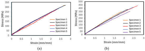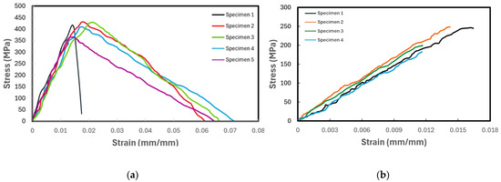 The basic mechanical properties of the composites were evaluated using the standard test methods as per ASTM. Tensile, compressive, and shear tests were conducted according to ASTM D3039, D3410, and D3518; the tensile and compressive tests were conducted on specimens with a [0/90]2,s layup; and the shear tests were performed on specimens with a [+45/−45]2,s layup. The tensile test cross-ply layup was used based on the fact that the LVI and HVI tests were conducted on cross-ply FRPs, which are commonly used in practical applications; therefore, it was concluded that the basic properties should also be evaluated on the same layup. Moreover, when a biaxial FRP with a relatively high fiber volume is subjected to tensile or compressive loading, a great percentage of load (>95%) of the load is sustained by the longitudinally oriented fibers. Finally, the compressive strength of a biaxial FRP can be calculated with great accuracy using the “back-out” factor, as documented in MIL-HDBK-17-F [51,52].