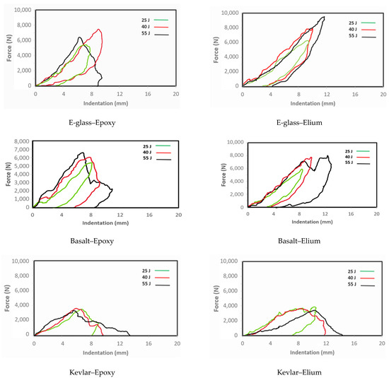 The impact characteristics of Elium composites have also been investigated by researchers; however, the volume of research concerning the low-velocity impact (LVI) of Elium composites is relatively quite limited and even more limited when considering HVI-related studies. It should be noted that when laminated composites are subjected to an impact loading, the energy is absorbed through several mechanics, including deformation delamination, fiber breakage, and matrix failure [20,21,22]. Bhudolia and Joshi [10] investigated the low-velocity impact response of a carbon–Elium composite against a carbon–epoxy composite. The Elium-based composite was observed to undergo 53% higher elastic deformation than its epoxy counterpart. Moreover, the authors observed comparatively 58% more absorbed energy by the Elium-based composite before the onset of a major failure, which was facilitated by a significant elastic–plastic deformation response. The performances of helmets made of carbon–epoxy and carbon–Elium composites by Gohel et al. [22] revealed the superior energy absorption capacity and impact energy dissipation capability of the carbon–Elium composite, which was attributed to the improved toughness of the Elium resin.