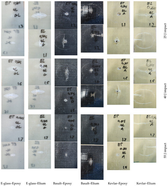 Figure 12. Typical post-impact damage modes of all composite types tested under low-velocity impact. Each row illustrates the front and reverse side of the specimens, sequentially.