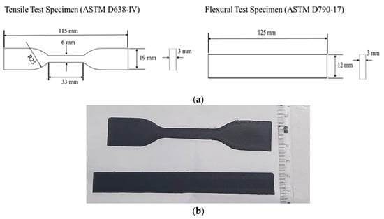 The test specimens were printed according to ASTM standards i.e., ASTM D638-IV [28] for tensile test and ASTM D790-17 [29] for the flexural test, as shown in Figure 1.