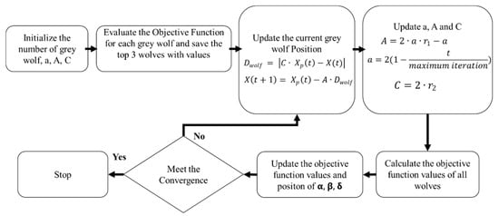 Figure 2 illustrates the flow chart for GWO. At the start of the algorithm, the fitness of each wolf’s position is evaluated using the objective function that needs to be optimized. The objective function assigns a fitness value to each wolf, which represents how close it is to the optimal solution. The wolf with the best fitness value is called the alpha wolf , the wolf with the second-best fitness value is called the beta wolf , and the wolf with the third-best fitness value is called the delta wolf (. The distance of each wolf from the positions of the alpha, beta, and delta wolves is computed using Equation (6). The position of each wolf is updated based on its distance from the alpha, beta, and delta wolves using Equation (7).
