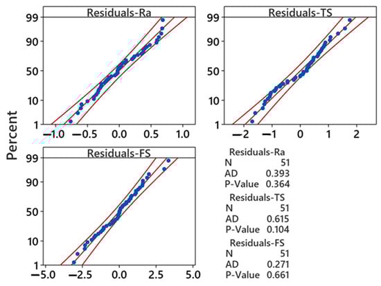 The adequacy of the ANOVA results is analyzed using a normality plot of residuals and validated using the Anderson–Darling (AD) test. Figure 3 shows the normality plots, revealing that data points for all measured responses closely align with the middle fitted line. This observation suggests that the data follow normal distributions. To validate this assumption, the AD test—a robust statistical tool commonly utilized for outlier detection within normal distributions—was applied. The decision to accept or reject the null hypothesis regarding the normal distribution of the data depends on the p-value obtained from the AD test. Figure 3 shows that the p-values for each response exceeded 0.05. This indicates strong evidence supporting the null hypothesis and affirms that the collected data are indeed normally distributed. Accordingly, the data can be confidently utilized for further experimental analysis and optimization processes.