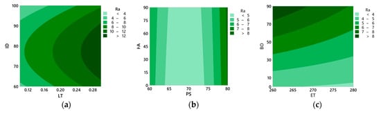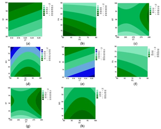 The effects of process parameters on average surface roughness (Ra), tensile strength (TS), and flexural strength (FS) were studied using contour plots, as illustrated in Figure 4 and Figure 5.