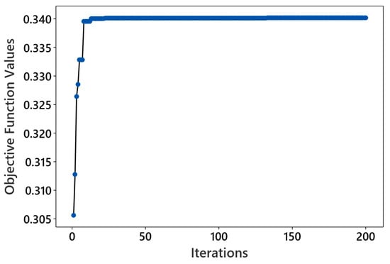 Figure 7 illustrates convergence plots obtained for the GWO, achieving its highest objective function value of 0.340 when 50 wolves are deployed over 200 iterations. The convergence plot demonstrates an upward trend, indicating effective improvement in solutions over successive iterations. The trajectory of the best objective function value reflects the dynamic nature of optimization, starting at 0.305 and showing substantial improvement to 0.339 by the 8th iteration. This initial phase of rapid enhancement suggests efficient navigation towards promising regions of the solution space. However, the objective remains almost consistent until the 12th iteration and then improves slightly to 0.340 by the 13th iteration, remaining constant thereafter until the maximum iteration of 200, indicating convergence.