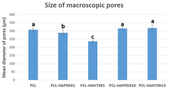Macropore diameter measurements on PCL and 70% PCL–30% SrHA composites. Results are represented as mean ± SD; different letters indicate significant differences between each sample (p < 0.05).