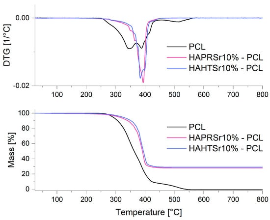 TG/DTG measurements on PCL and composite scaffolds containing HAPRSr10% and HAHTSr10%.