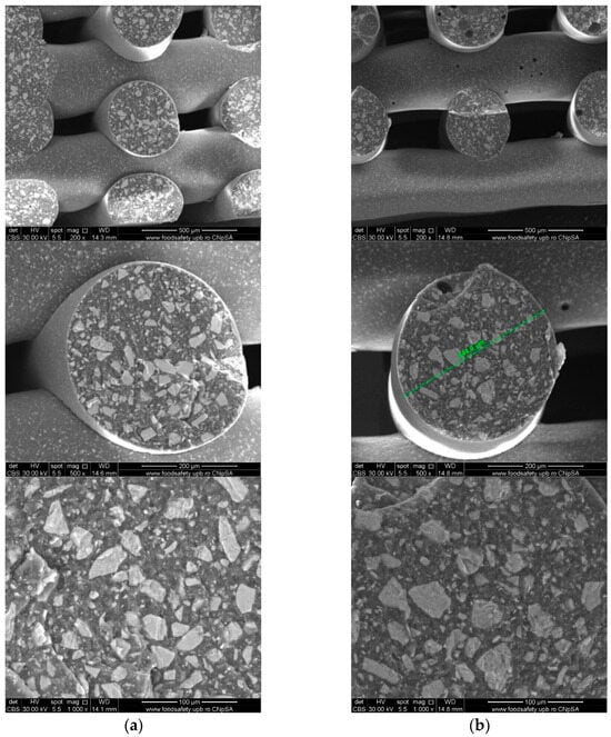 To investigate the obtained scaffolds’ surface morphology and strands’ dimensions, SEM analysis was performed. Morphological evaluation of the 3D-printed scaffolds at different magnifications showing strands and surfaces indicate that the printed scaffolds displayed a high level of fidelity to the original CAD model (Figure 4, Figure 5 and Figure 6), with completely open and interconnected pore architecture. Strand diameter was measured using ImageJ 1.54d software for several samples (Figure 7) and the average value was close to the theoretical target value of the printing needle (400 μm). Simple PCL strands had statistically significant bigger values than the composite strands due to the typical behavior of viscoelastic polymer-based biomaterial inks, that tend to expand upon extrusion from the nozzle [31]. However, no significant differences were observed between the composites containing 10%Sr.