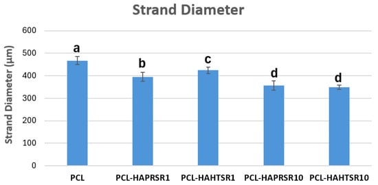 Strand diameter measurements on PCL and 70% PCL–30% SrHA composites. Results are represented as mean ± SD; different letters indicate significant differences between each sample (p < 0.005).