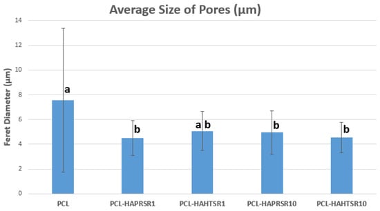 The average size of pores using Feret diameter measurements on PCL and 70% PCL–30% SrHA composite samples. Results are represented as mean ± SD; different letters indicate significant differences between each sample (p < 0.05).