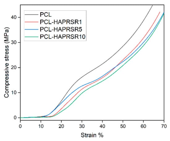 Compressive stress–strain curves for PCL, PCL–HAPR-Sr1%, PCL–HAPR-Sr5%, PCL–HAPR-Sr10% scaffolds.