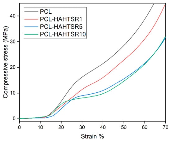 The compressive mechanical properties of simple PCL and PCL–SrHA composite scaffolds were investigated, as they represent key requirements for bone scaffolds. The representative compressive stress–strain curves are shown in Figure 10 and Figure 11. Stress–strain curves of both simple PCL and PCL–SrHA composite scaffolds include the three distinct regions also reported by other authors [35], respectively: firstly, the linear elastic region, secondly, the plateau of roughly constant stress, and thirdly, the final densification region of steeply rising stress. Other authors [36] indicate that these three main regions correspond, firstly, to the increase in compression force that leads to an increase in strength, when the thin bonding bridges between the struts begin to crack, secondly, to the strength decrease due to the struts cracking in the stress accumulation areas, and thirdly, strength increases again due to the rearrangement of the material.