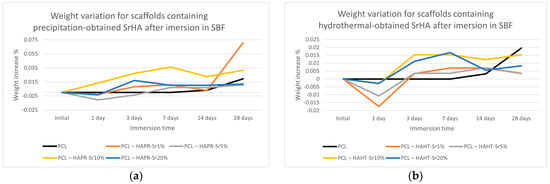 As shown in Figure 12, the weight of the scaffolds varied only slightly, but in a similar fashion for most of the samples. Scaffolds containing precipitation-obtained SrHA had a higher increase in weight in general, with PCL–HAPR-Sr1% and PCL–HAPR-Sr10% having noticeable variations. Pristine PCL scaffolds are considered to have an initially very low erosion of less than 1 wt.% in the first month of exposure to physiological conditions. In contrast, composite scaffolds are considered to exhibit weight loss within the first week of exposure to physiological conditions [37]. Possible initial degradation may have happened to the composite scaffold in contrast with the pristine PCL scaffolds (Figure 12). In the case of the PCL-HAHT samples, this possible event is emphasized by a more dramatic weight loss (Figure 12b). Towards the later stages of the experiment, the apatite layer deposition may have reversed the loss of weight.