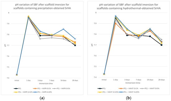 pH variation of SBF after scaffold containing precipitation- (a) and hydrothermal- (b) obtained SrHA immersion for various periods of time.