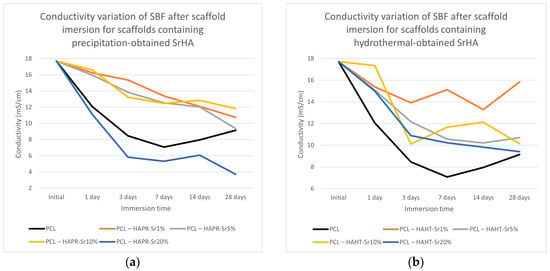 Conductivity variation of SBF after scaffold containing precipitation- (a) and hydrothermal- (b) obtained SrHA immersion for various periods of time.