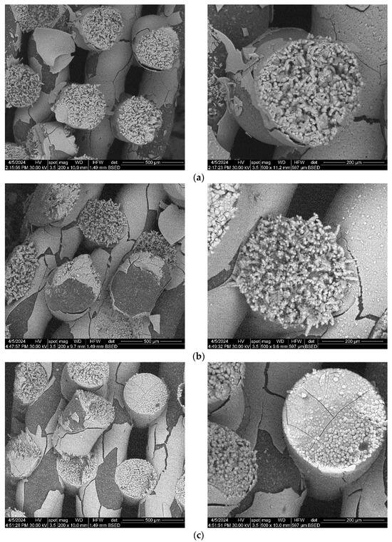 Images acquired at higher magnification using a top-view scan and the backscattered electron (CBS) mode evidenced the presence of SrHA particles and micro-porosity on the surface of all analyzed samples (Figure 8). Composite filaments’ surface appeared less smooth than the simple PCL. More and smaller micropores can be observed in the case of composite scaffolds, compared with simple PCL scaffolds. This might be due to the collision of ceramic particles with PCL crystalline regions growing during solidification, as other authors mention [32]. Cross-section images, even on lower magnification, indicate the agglomeration or clumping of the ceramic particles in the composite-based samples in both CBS and Everhart–Thornley Detector (ETD) modes (Figure 5 and Figure 6) but there is no critical agglomeration which means that homogenous materials were obtained.