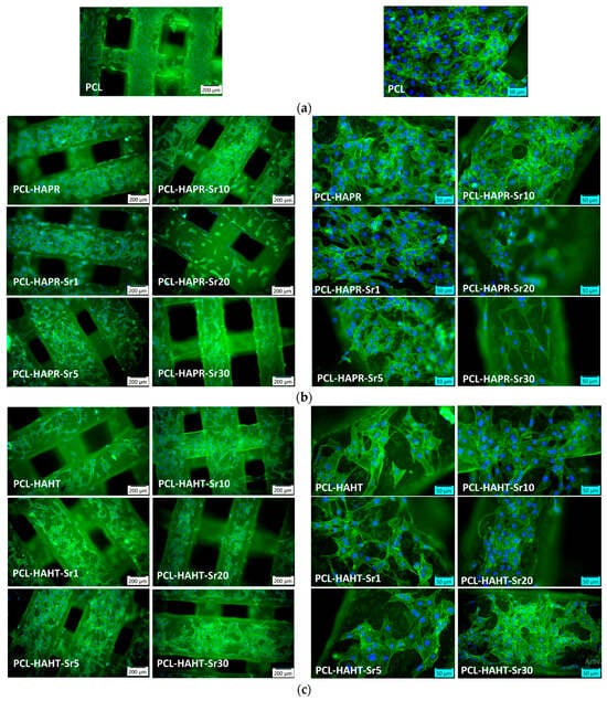 In order to assess the biocompatibility of the different types of 3D-printed scaffolds, the F-actin staining of MC3T3-E1 cells attached on the surface of these materials was performed. The images shown in Figure 17 revealed a good adhesion of these cells for all types of scaffolds tested, being distributed within the whole surface of them after 24 h of incubation. A good cytocompatibility was noticed for PCL sample (Figure 17a), as it was previously reported [27]. In the case of samples containing SrHA obtained by precipitation, the best cell morphology was achieved for Sr1, 5, and 10 (Figure 17b). For HAHT-based samples, the addition of Sr increases the cell attachment compared to PCL-HAHT scaffold (Figure 17c). The analysis of images captured at a higher magnification indicated a higher cell density for PCL-HAPR, PCL-HAPR-Sr1, 5, and 10, being observed an organized actin filaments network with numerous cell-to-cell junctions, which suggest a functional osteoblast phenotype. In addition, a good cell interaction was shown for PCL-HAHT-Sr30.